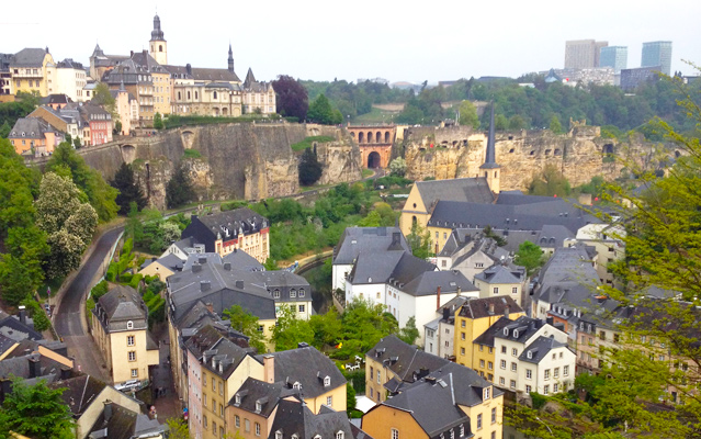 Kortteli nimeltä Grund Luxemburgin keskustassa. Oikealla ylhäällä näkyy hiukan Kirchbergiä.