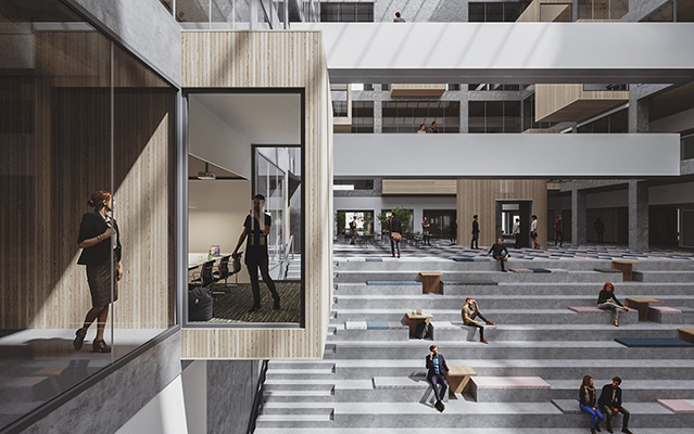 Havainnekuva rakennuksen keskiaulan portaikosta. Kuva: Sigge Arkkitehdit