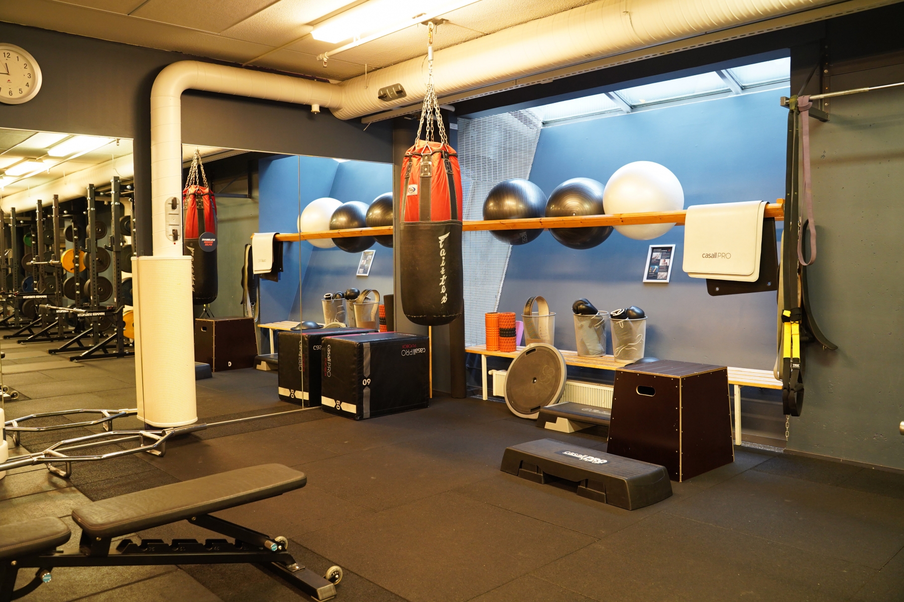 – Meillä on salin puolelle lisätty vapaita painoja, joten niitä riittää kaikille, vaikka paikalla olisi enemmänkin porukkaa. Perinteisempien laitteiden lisäksi vaikka kahvakuulilla ja oman kehon painolla saa tehtyä jo tosi monipuolisen treenin. Keskellä tilaa pääsee myös työntämään kelkkaa, ja nyrkkeilysäkki on vapaassa käytössä, Ketola vinkkaa.