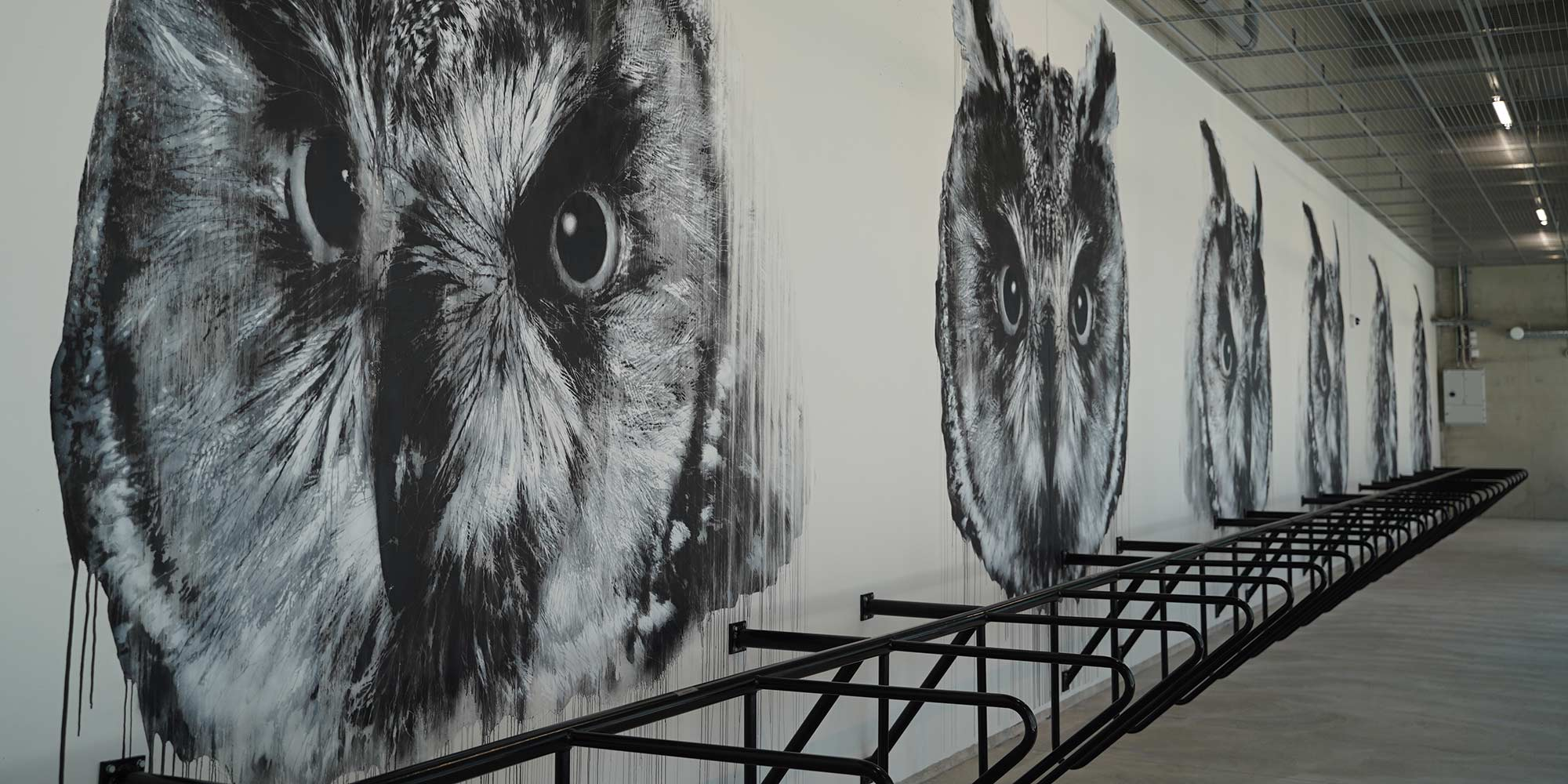 ParkCityn pyöräparkissa komeilee Jussi TwoSevenin sabluunatekniikalla maalaama Asio otus -taideteos.