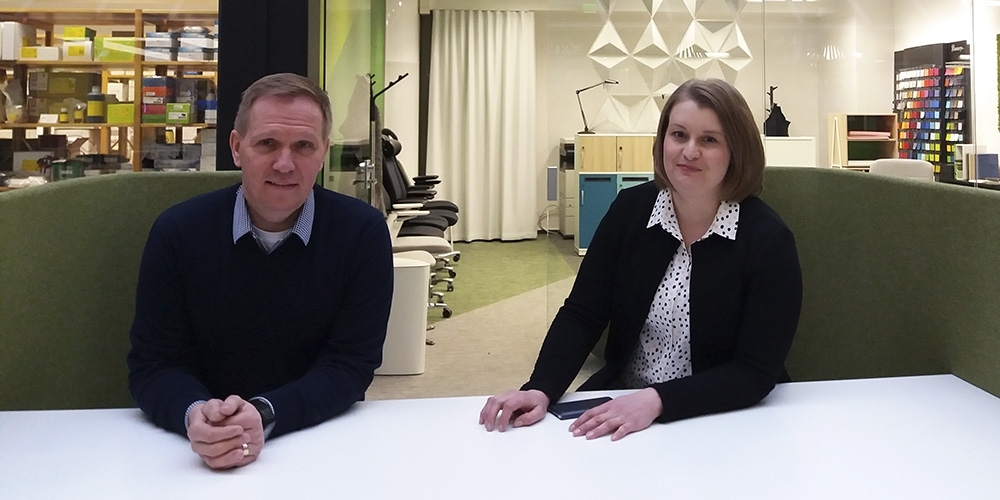 Kinnarps Oy:n BioCityn toimipisteessä työskentelevät asiakkuuspäälliköt Jouni Kyllönen ja Piia Santti kertovat Kinnarpsin taustasta.