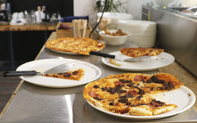 Lounasbuffetissa on päivittäin tarjolla pizzaa kahdella eri täytteellä.