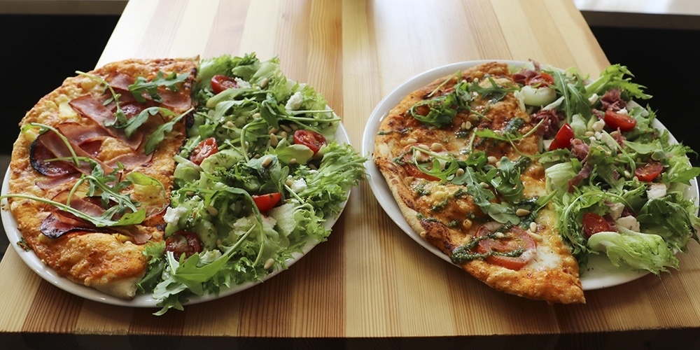 Nooran opera -pizzan puolikas sisälsi kinkkua, salamia, ananasta ja rucolaa. Lautasen toinen puoli eli salaatti Little italy -täytteillä sisälsi buffalomozzarellaa, tomaattia, pinjansiemeniä, mustapippuria, basilikapestoa ja rucolaa.