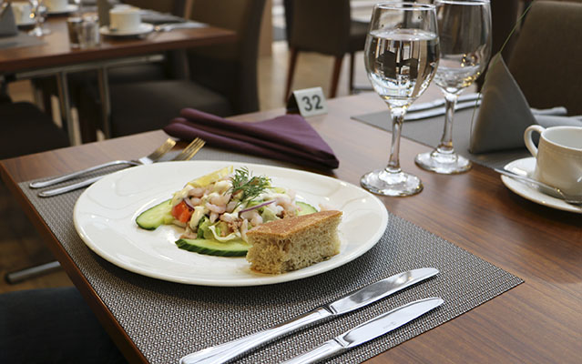 – Salaatti oli aika runsas, ehkä hieman vähempikin määrä riittäisi. Simppelin raikas salaatti ja tuoreet vihannekset, tämä oli sitä mitä odotinkin, kommentoi Julia. Ulkonäöltään alkusalaatti oli melko perinteinen, koristeena sitruunasiivu ja tillinoksa. Palvelu oli ripeää, ja henkilökunta oli tilanteen tasalla.
