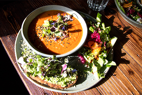 Alkupalaksi Ulla ja Terhi päättivät puolittaa vitriinissä näkemänsä avokado-superleivän, joka oli erittäin maistuva ja jonka avokado oli juuri sopivan kypsää. Pääruuaksi Ulla valitsi viikon keiton, johon kuului tomaattikeittoa, avokado-siemenleipää hernepestolla ja pieni ”side salad”.