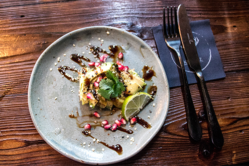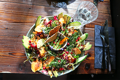 Terhi valitsi pääruuaksi vegaanisen salaatin, jossa oli avokadoa, lehtikaalia, pähkinöitä, paahdettua bataattia, erilaisia marjoja, kurkkua ja hernepestoa. Salaatti oli suuri ja muistutti ulkonäöltään enemmänkin asetelmaa kuin ruoka-annosta. Myös maut olivat kohdillaan, joskin Terhi jäi kaipaamaan vielä jotakin.