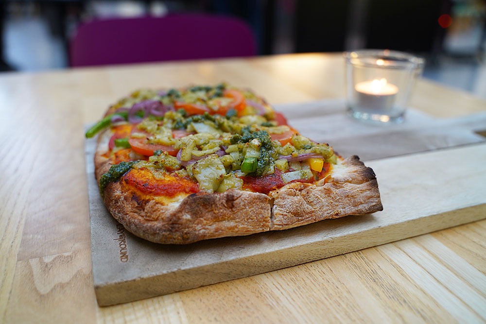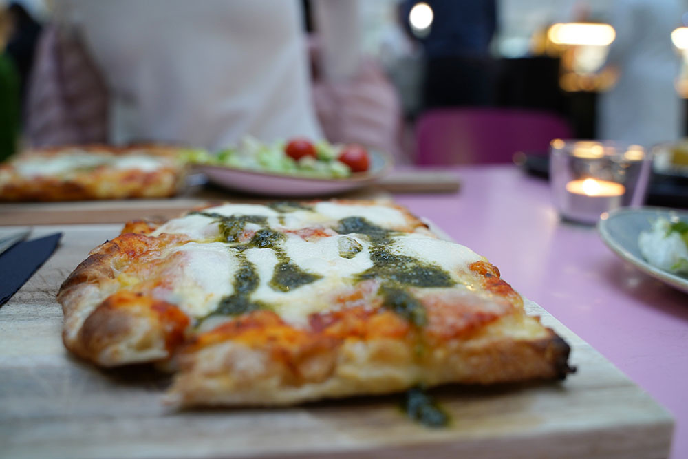 Rapeapohjainen pizza oli sopivan kokoinen annos lounaalle. Nälkäiset lounastajat olivat tyytyväisiä myös täytteiden määrään ja ainesten tuoreuteen. Etenkin laadukas juusto ja raikas pesto jäivät kaikille mieleen.