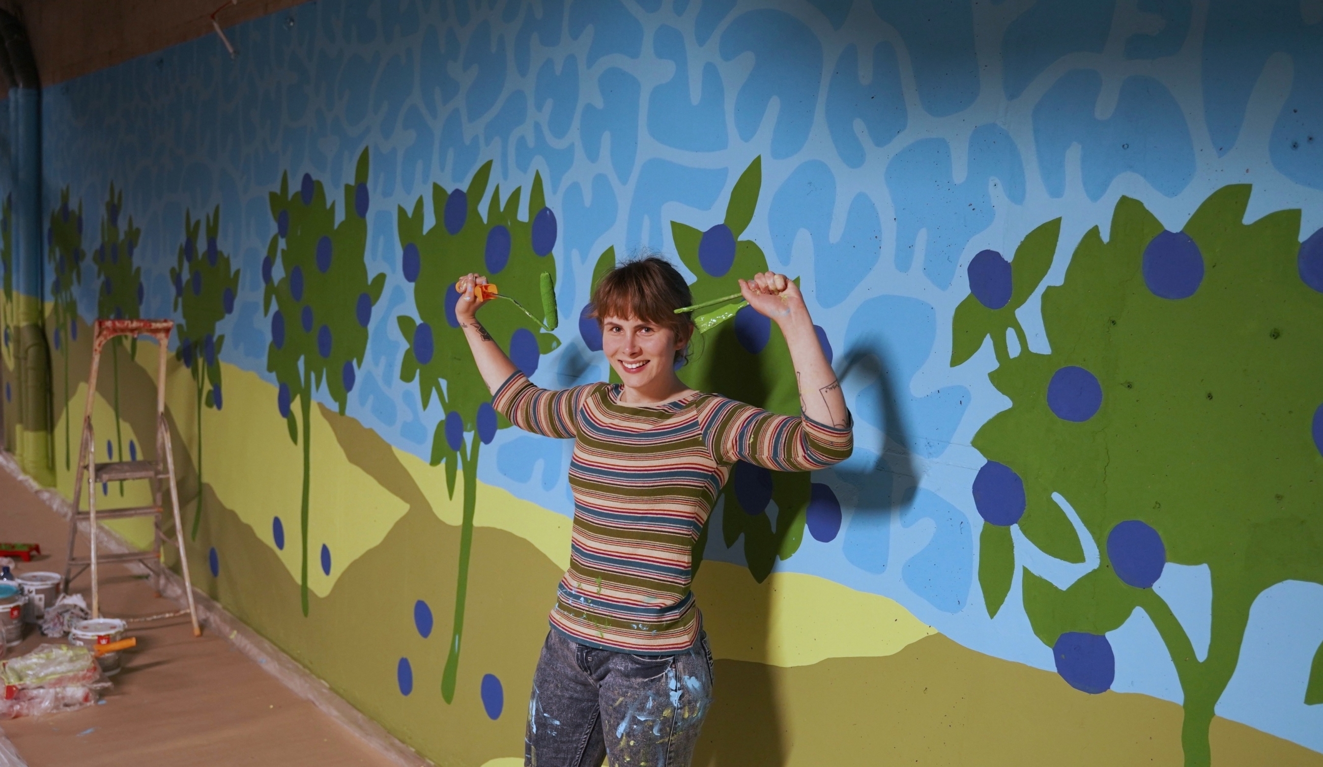 – Haluan aina kertoa taiteellani jonkun kivan viestin. Tänne ehdottamani Mustikkametsä-teos sai alkunsa siitä, että olen itse aina viihtynyt mustikkametsässä ja ajattelin, että ehkä katsojallekin tulee hyvä fiilis tai jokin lapsuusmuisto mieleen nähdessään parkkihallissa vihreyttä ja mustikoita, Wallin selittää.