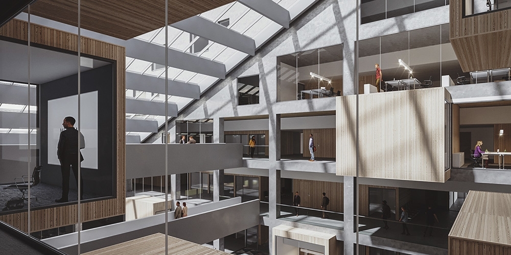 Havainnekuva rakennuksen keskiaulan portaikosta. Kuva: Sigge Arkkitehdit