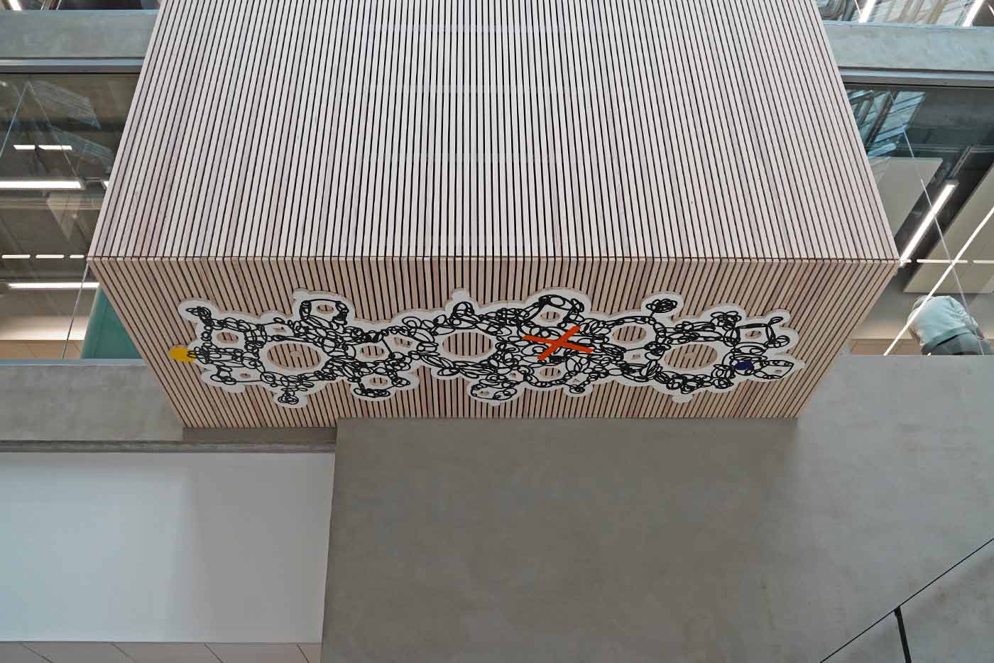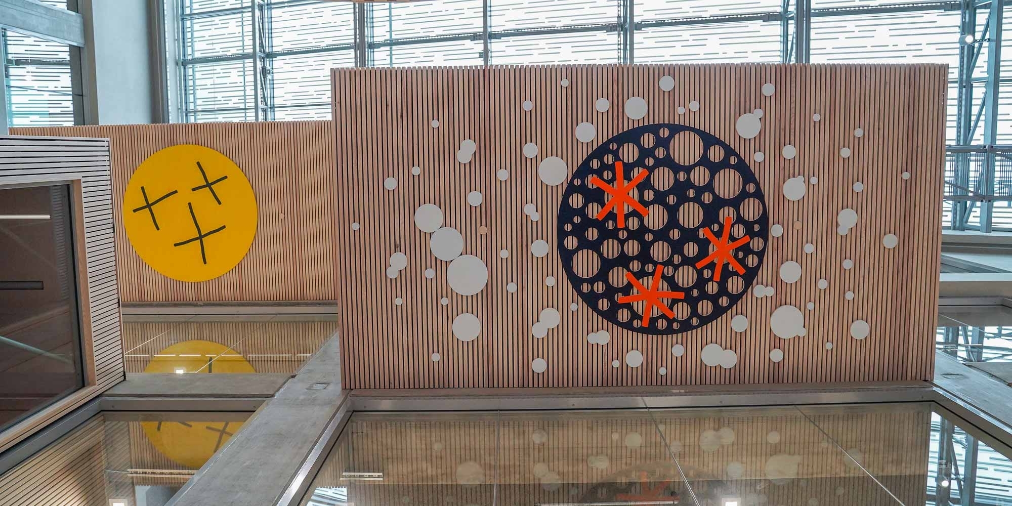 EduCityn keskiaulaa hallitsee suuri kattoikkuna. Tilassa ei ole valkoisia seiniä, joten Baumgartner päätti tehdä maalauksista kattoreliefejä.