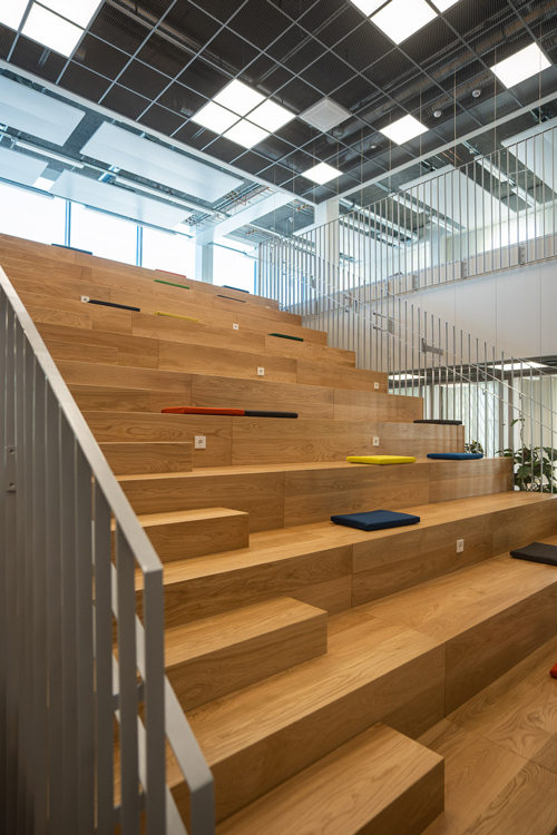 Toista ja kolmatta kerrosta yhdistävät katsomona toimivat portaat.