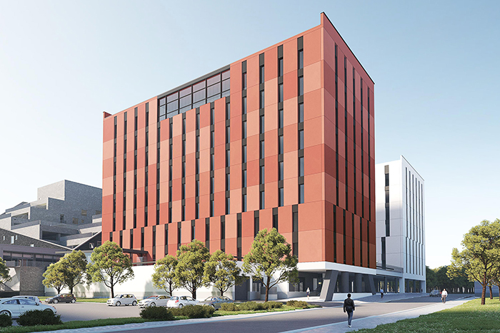 Havainnekuva Lemminkäisenkadun suunnasta. Vasemmalla EduCity ja oikealla Pohjola Sairaala. Kuva: Aihio Arkkitehdit.