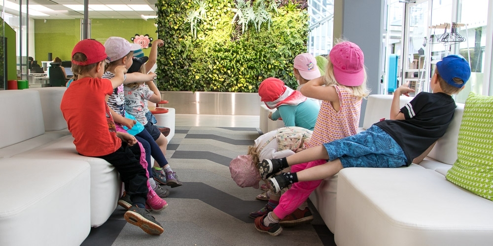 Olemme Tervalepät Turun kaupungin Itäharjun päivähoitoyksiköstä. Olemme täällä BioCityssä, koska tulimme tänne katsomaan lähihoitajaopiskelijoiden tekemää teatteriesitystä nimeltä Siivooja Sissi ja seitsemän prinsessaa. Esityksen jälkeen tulimme vierailulle Teknologiakiinteistöjen toimistolle.