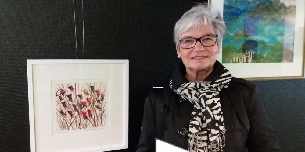Kyllä. Minulla on itseltänikin näyttelyssä esillä kaksi akvarellia, Spegling ja Ruusunnuput. Ruusunnuput on tehty akvarellimonotypialla. Siinä akvarelli maalataan laatalle, josta se painetaan paperille. Tekotavasta tekee ainutlaatuisen se, että laatta on kertakäyttöinen ja näin jokainen akvarelli on uniikki. Spegling taas on hieman erilainen maisemamaalaus. Siinä on kuvattu maiseman heijastuminen veteen.